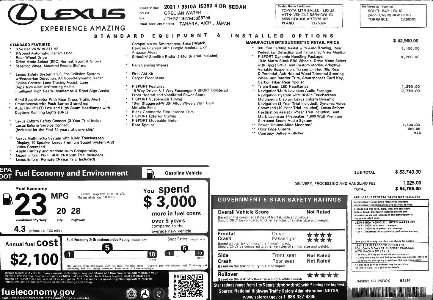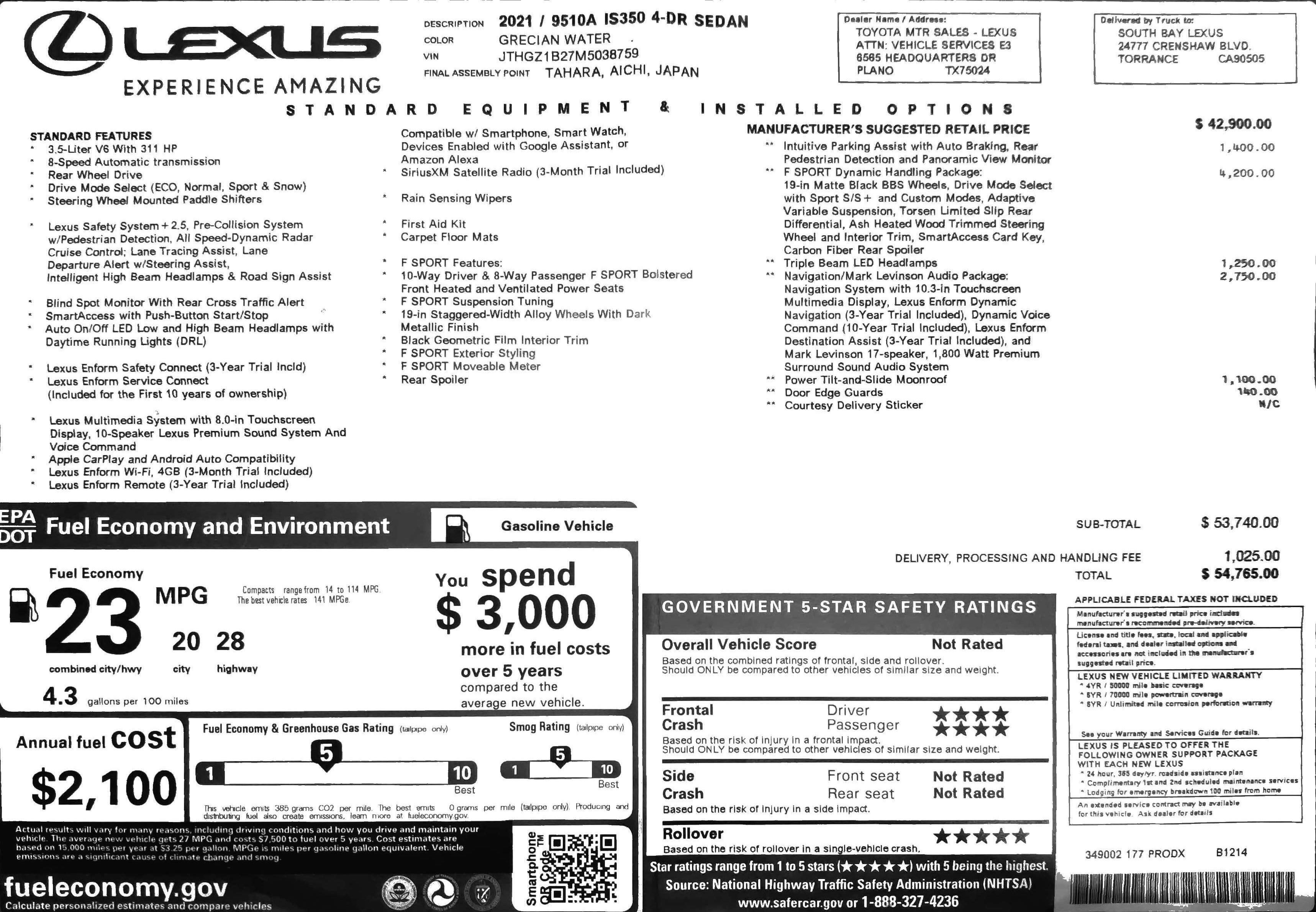 The IS 350 RWD starts at $43,925, but mine was chock full of upgrades and totaled $54,765. I had Intuitive Parking Assist ($1,400) that included rear pedestrian detection and automatic braking if you're about to back into something.