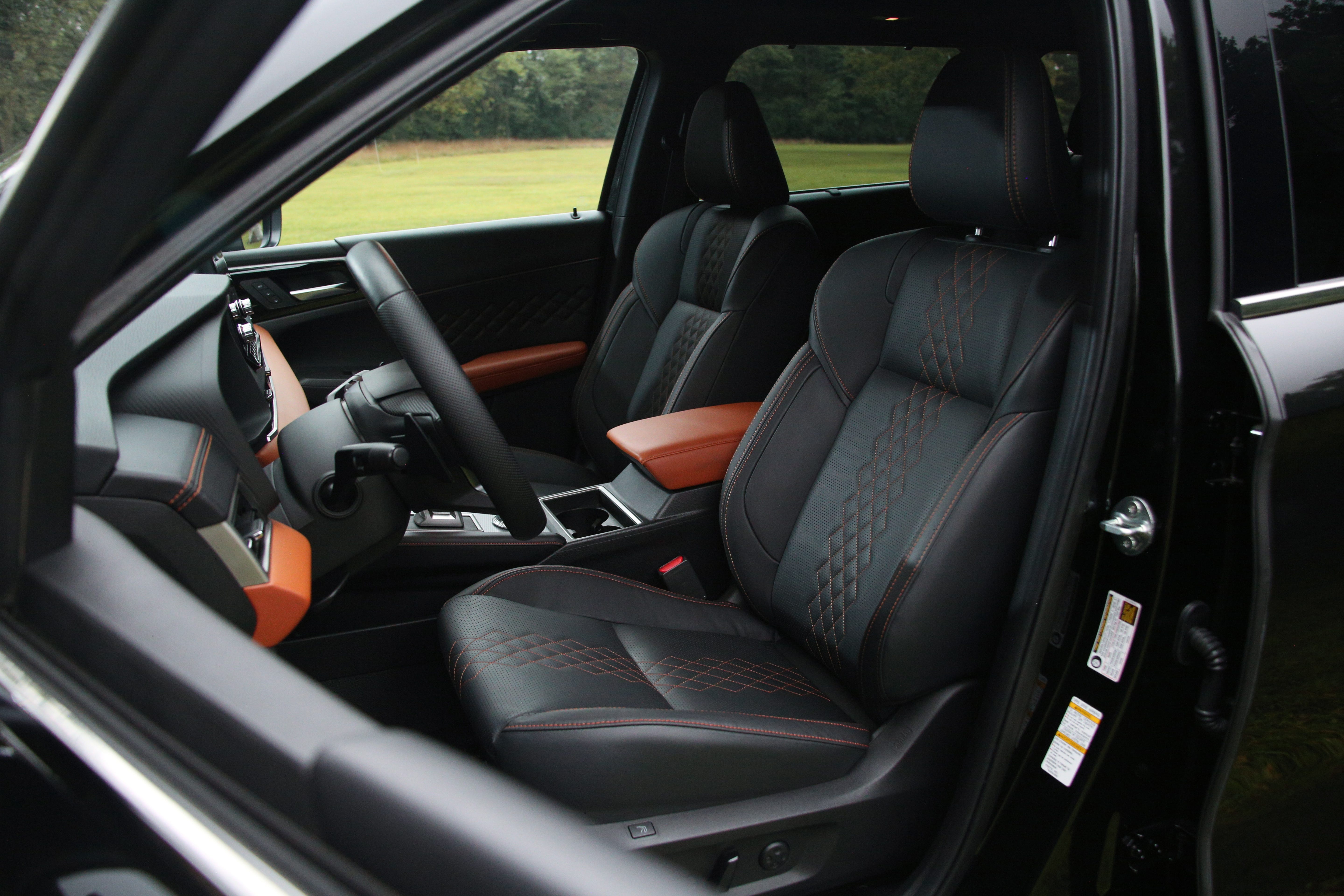 The interior surfaces look great, though they feel a bit cheaper than you might hope for a $50,000 vehicle. My tester had an attractive orange-and-black theme to the interior, with several large splashes of color on different elements like the armrests and matching quilted stitching.